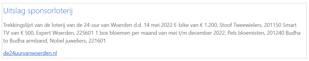 Ik wil loten kopen voor het Samen Sterk huis in Woerden voor de 24 uur van Woerden. De kosten zijn 1,- per lot. Er wordt een sponsorloterij georganiseerd tijdens de 24 uur van Woerden waar leuke prijzen vallen te winnen met het kopen van één of meerdere loten maakt u hier kans op en helpt u het goede doel. Benieuwd naar de prijzen van de vorige editie? Kijk dan hier!